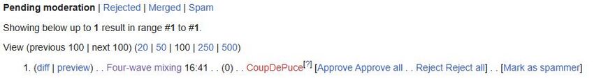(diff | preview) . . Four-wave mixing 16:41 . . 0‎ . . CoupDePuce[?] [Approve Approve all . . Reject Reject all] . . [Mark as spammer]