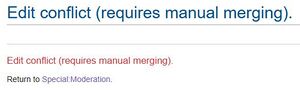If several modifications are made to the same page at the same time, a conflict is created between the different versions. During moderation, if an attempt is made to approve a version based on a page that has already been modified, an error message appears. The different versions must then be merged manually. To do this, a new editing window opens, containing the text editor of the last existing and validated version, and below that, the version awaiting validation.