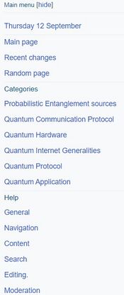 The main page is made up of the semantic network that forms the fabric of the "Quantum Communication Networks" Wiki. It is possible to navigate between pages by clicking on the nodes of the graph, by clicking on ‘Random page’, on a link in a page, via the categories or by using the menus. To switch to the French version of the "Quantum Communication Networks" wiki, simply click on one of the following two buttons: